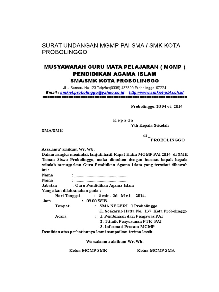 Musyawarah guru mata pelajaran bahasa inggris sekolah menengah pertama mgmp bahasa inggris smp sekertariat : Begini bentuk surat undangan dpp pdip kepada pengurus daerah. Tak hanya soal jumlah maupun isi undangannya, masalah desain pun jadi hal bagi anda yang masih bingung soal pembuatan undangan, berikut ini akan diberikan beberapa contoh desain yang unik. Misalnya saja melalui panggilan telepon ataupun chatting. Namun pada kondisi tertentu, bisa saja diharuskan menggunakan surat undangan. Kenduri sangat erat kaitannya dengan masyarakat suku jawa. Berikut kami berikan contoh surat undangan resmi yang bisa dijadikan referensi dalam pembuatannya. Surat undangan adalah sebuah surat yang dikeluarkan baik oleh pribadi maupun lembaga atau perusahaan yang ditujukan kepada pihak yang bersangkutan dengan isi untuk mengundang mereka agar hadir pada acara yang dibuat. Kumpulan contoh surat keterangan penghasilan, kerja untuk kpr, domisili, usaha, pindah sekolah, kuliah dan lain sebagainya, lengkap dengan file docx. Kegiatan tersebut bisa berupa acara maupun rapat yang akan dilangsungkan dalam waktu dekat. Contoh surat undangan resmi sangat banyak, namun pada umumnya memiliki tujuan yang sama, yakni mengundang pihak lain untuk menghadiri sebuah kegiatan. Dalam suatu instansi atau perusahaan diperlukan. Contoh surat undangan pengajian download doc menit info.